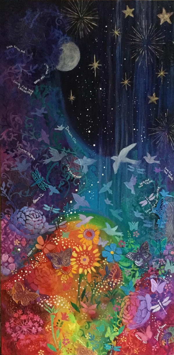 “Dream On” is a mixed media painting that was inspired by the idea of transformation. Throughout the painting are butterflies and dragonflies, which symbolize rebirth and transformation and birds which are seen as messengers to the stars. Woven throughout are the lyrics of “Dream On” by Aerosmith, words very meaningful to a young friend who has passed on. |