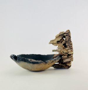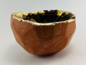 Kiln fired Nex̱wlélex̱wm clay, paper wasp nest, gold leaf |